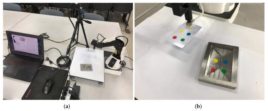 As demonstrated in Figure 11, a visual servoing system is established. The experimental setup consists of a camera, a computer, and a robot (Dobot Magician) with four DOF. The software was coded by MFC with OpenCV 3.2 and consisted of three parts: (1) a camera and a robot control system, which includes initialization, start and stop functions, and parameter setting; (2) a real-time display system consisting of an image display and information display; and (3) an information storage system, which was designed to save important data throughout the program operation. The camera is MER-200-14GC with a 12-mm lens and a image resolution. The robotic arm has a repeated positioning accuracy of 0.2 mm and a minimum movement distance of 0.05 mm. As illustrated in Figure 12, the workpiece is a white card with four colored circles, and the base plate is a slot the same size as the white card. The inside slot is also marked with colored circular marks, ensuring that the relationship between the white card and the slot meets the space constraint.