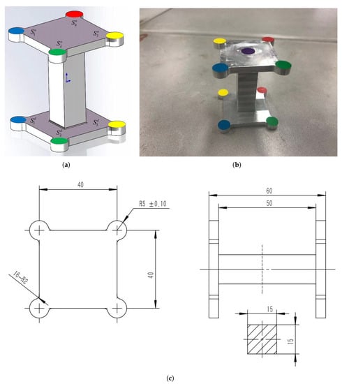 The homography matrixes mentioned in Section 3.1 were produced using a customized calibration block with two parallel plates, as shown in Figure 12a. Each plate has four incomplete circular regions, the centers of which create a cuboid with known dimensions in space. The most significant advantage of the calibration block is that it allows the camera to observe all circular regions simultaneously without obstruction. Figure 12b depicts an aluminum calibration block with a production error of less than 0.1 mm, and Figure 12c depicts the exact dimensions of the calibration block. All circular regions were marked with different colored stickers, and the purple sticker was used to differentiate the plate.