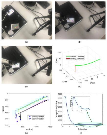 Experimental result of visual servoing control method based on perspective transformation: (a) Starting position of the robotic arm. (b) The robotic arm reached the assembly node. (c) The assembly task is accomplished. (d) Complete Spatial trajectory of the robotic arm. (e) Image trajectory. (f) Position error in the image.