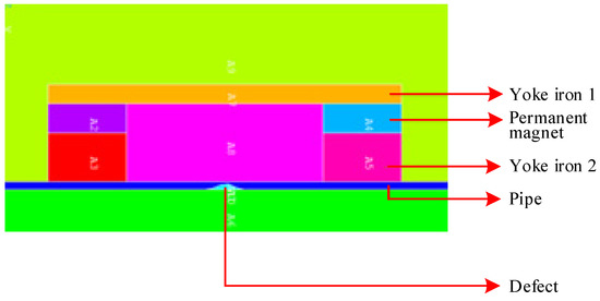 In this paper, the software ANSYS 19.0, based on the method of finite-element analysis, is adopted to build and solve the simulation forward model of the defect MFL. In order to ensure a degree of agreement between the FEM model and the actual physical process, it is necessary to ensure that the parameters (such as permeability, model size, coercive force, etc.) of each element (such as permanent magnet, yoke iron, pipe wall, etc.) in the simulation model are the same as or similar to the parameters of the actual detector. The structure and material properties of the model are shown in Figure 2 and Figure 3 and Table 1.
