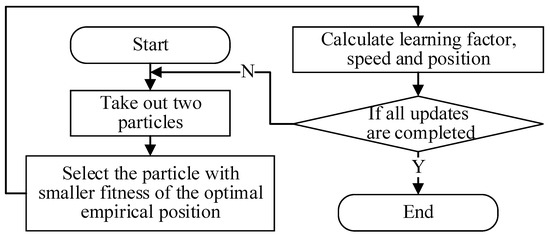 In the early stage of the algorithm, particle swarm optimization needs to improve the diversity of the population to enhance the global search ability of the population and avoid prematurely falling into local extremum. As a result, it is more important to introduce a certain rate of update randomness and divergence to other particles in order to increase particle position diversity. However, in the later stage of the algorithm, PSO focuses more on the fine local development of the better position, so it is necessary to appropriately weaken the learning of other particles to weaken the instability of the population movement, so as to facilitate the development of the current better position and find the optimal solution. The improved speed update process is shown in Figure 6.
