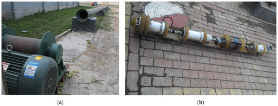 Photos of the test field and MFL internal detector. (a) The traction test field; (b) The MFL internal detector.
