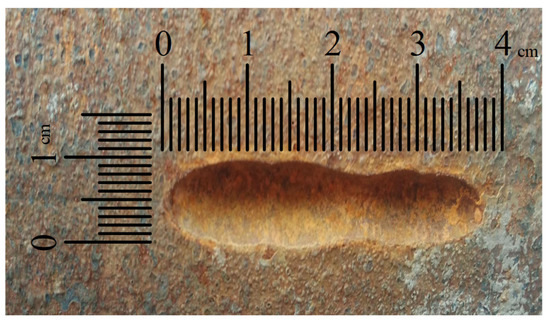 A non-standard defect (as shown in Figure 8) was selected from the 40 defects as the target defect of the experiment in this section. The size characteristics of the defect were as follows: the length was 3.8 cm, the width was 1 cm, and the depth of the deepest point was 0.44 cm.