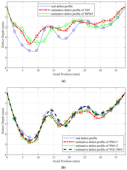 Defect profile curve estimated by five optimization methods. (a) ‘GD’ algorithm and ‘BPSO’ algorithm; (b) ‘PSO-1′ algorithm, ‘PSO-2′ algorithm and ‘FGC-PSO’ algorithm.