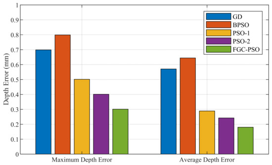 In addition, five different optimization methods were used to iteratively inverse the defect profile in Figure 10. The five methods are: 1. GD, the gradient descent algorithm; 2. BPSO, the basic particle swarm optimization algorithm; 3. PSO-1, the PSO algorithm with improved self-adaptive inertia weight; 4. PSO-2, the PSO algorithm with improved speed updating strategy; 5. FGC-PSO, the fast globally convergent particle swarm optimization algorithm proposed in this paper. The maximum number of iterations was set to 40 times with the defect DOFs of 15. The inversion results of these five methods are shown in Figure 10. The results of the statistical maximum depth error and average depth error are shown in Figure 11.