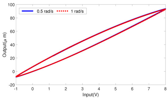 First, a low scanning frequency sinusoid signal is input into the piezoelectric actuators platform, in which the dynamics of the piezoelectric actuators is small enough to be ignored and the overall hysteresis is regarded as only including the static hysteresis. As shown in Figure 1, for low frequency scanning, the system dynamics is neglectable, and the static hysteresis loops of (blue solid line) and (red dotted line) closely coincide with each other. As shown in Figure 2, from to , the hysteresis loop expands rapidly with the increase of the scanning frequency, comparing with that of and , where the increased part of the hysteresis loop is determined by the dynamic characteristics. To facilitate the subsequent calculation, the hysteresis loop of is selected to calculate the static hysteresis function, whose discrete equation is expressed as follows: