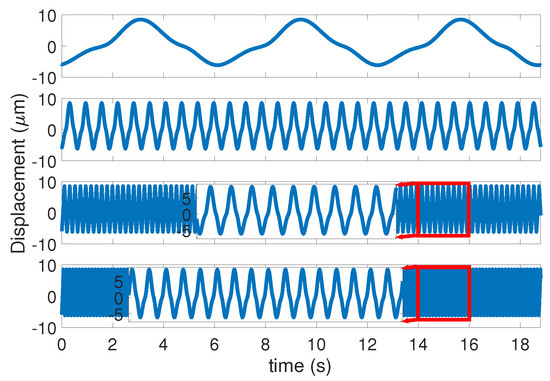 The tracking results of the sinusoid reference signals in , , with the trip length of m are presented in Figure 10, Figure 11 and Figure 12. The top subfigures of Figure 10, Figure 11 and Figure 12 are the piezoelectric actuators displacements of the system and the references trajectory, which reveal that, in large travel range and relatively high speed, the control method proposed in this paper can compensate for the nonlinearity and disturbances to guarantee the tracking task in high accuracy. The middle subfigures of Figure 10, Figure 11 and Figure 12 illustrate that the closed-loop system errors stabilize in a very small neighborhood of zero, which corresponds to the stability theorem in Section 4. It can be seen from the results that, since the convergence result of the closed-loop system is GUUB, the tracking error converges to a small neighborhood of zero displacement and cannot completely converge to zero displacement. The mean absolute error (MAE) of the control methods in are m, m and m in , and , respectively, which are , and of the m trip length, respectively. The tracking error increases when the signal angular velocity speeds up.