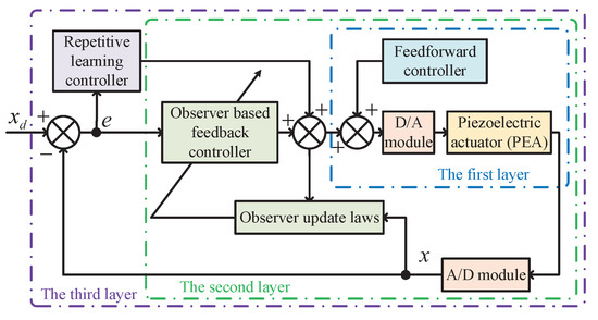 As shown in Figure 5, to facilitate the analysis and illustrate the work principle more clearly, the discrete compound control strategy is divided into three control layers. In the first layer, the static amplitude-dependent hysteresis is compensated by the feedforward sub-controller and the feedback controller, respectively. In the second layer, the dynamic rate-dependent hysteresis is compensated by the system state feedback sub-controller, and specifically, an online discrete observer is designed to provide real time correction for the disturbance. In the third layer, the Lyapunov-based repetitive learning sub-controller is employed to eliminate periodic unmodeled dynamics during the tracking process. As illustrated in Figure 5, the compound controller is expressed in a form of three sub-controllers, as follows: