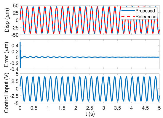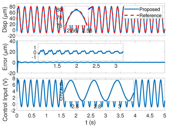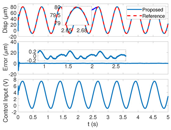 The tracking performance of the sinusoid signal in with a rip length of m is presented in Figure 6. The top subfigure presents the output displacement of the system in contrast with the reference, which reveals that, with a large travel range and relatively high speed, the proposed control strategy can compensate for the nonlinearity, disturbances, and uncertainties to ensure high accuracy tracking. The middle subfigure illustrates that the tracking error converges to a very small neighborhood of zero. The oscillating actions in the starting transient interval are caused by the large initial step of thermal drift. The mean absolute error (MAE) of the control method in is 0.0054 m, which is neglectable when compared with the trip length. The bottom subfigure is the control input, which is smooth and effective.