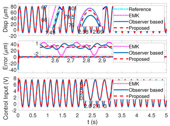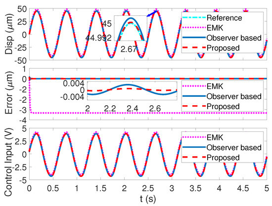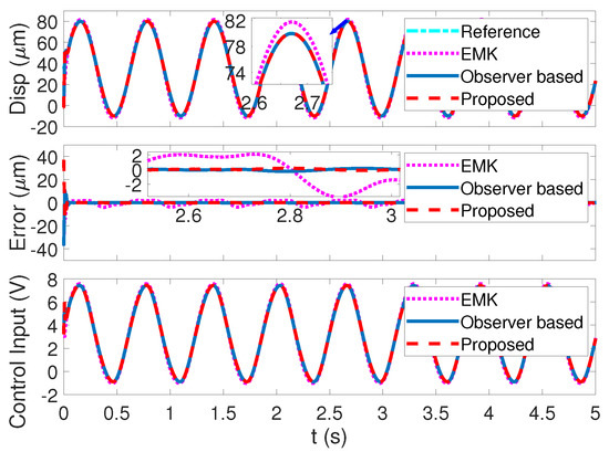 The tracking accuracy comparisons with the two other nonlinear control technologies in the piezoelectric actuators platform are presented in Figure 13, Figure 14 and Figure 15 with angular velocities of , , and , respectively. The total mean absolute errors (MAEs) of the three control methods are shown in Table 2. As presented in Figure 13, the reference sinusoid signal with a 90 m range in is tracked via three control strategies. The mean absolute error (MAE) of the control methods proposed in this paper, the observer-based method and the EMK method, are 0.1418 m, 0.1607 m, and m, respectively. The proposed method has a minimum tracking error, but only by a very small margin compared with the observer-based method. In Figure 14 with a tracking signal in angular velocity of , the mean absolute error (MAE) of the control methods proposed in this paper, the observer-based control algorithm, and the EMK control algorithm are 0.2885 m, 0.5228 m, and 0.9135 m, respectively. With the tracking velocity speeding up, the proposed method begins to widen the advantage in tracking accuracy. It is worth noticing in Figure 14 that, in the top subfigure, the EMK method seems to be closer to the reference in the enlarged view of the peak. Thus, one more enlarged view is added to help illustrate the comparison. Moreover, according to the mean absolute error (MAE), it is very clear that the proposed method has the smallest mean absolute error in the above three control methods. As presented in Figure 15 with the tracking signal in angular velocity of , the mean absolute error (MAE) of the control methods proposed in this paper, the observer-based control algorithm, and the EMK control algorithm are 0.4274 m, 1.1927 m, and 1.5036 m, respectively. The control method proposed in this paper further widens the advantage.