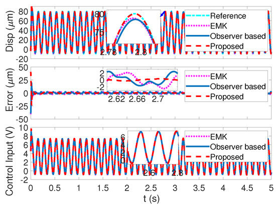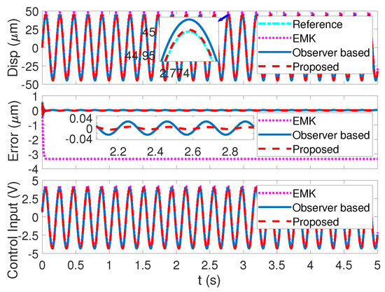 To further analyze the performance of the proposed strategy, comparisons with the EMK control strategy in (61) and the observer-based state feedback control strategy in (62) are made for tracking large range periodic signals with different angular velocities.