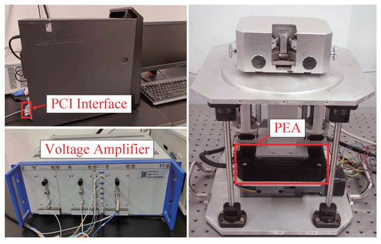As presented in Figure 9, experiments in this paper are conducted on the piezoelectric actuators platform (P-517.3CD, Physik Instrumente) installed on a self-made cross-scale atomic force microscope. The mass of the sample platform loaded on PEA is about . The piezoelectric actuators platform is linked with the voltage amplifier (E-505, Physik Instrumente), and the range of the input voltages in the voltage amplifier are from to and the range of the output voltages are from to . The capacitive displacement sensors are embedded in the piezoelectric actuators platform with interfaces in the E-505 voltage amplifier. The E-505 voltage amplifier is linked with the PCI-1716 data acquisition card (Advantech) embeded in the computer. The computer receives the data from the PCI card in real-time and then processes via the nonlinear control algorithm with the toolbox of real-time windows target in MATLAB/SIMULINK, where the discrete control strategies are programmed and performed. The sampling period of the hardware experiment platform is .