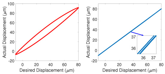 Hysteresis, behaving as significant nonlinearity between input voltage and output displacements, is the main reason of positioning error. In fact, the hysteresis effect of the PEA turns even worse as the travel range becomes larger. Specifically, the hysteresis can be divided into two categories: static hysteresis and dynamic hysteresis. Static hysteresis is caused by the inertial physics of piezoelectric actuators themselves and is mainly related to the travel range, while dynamic hysteresis is stimulated by the input signal and mainly relates with the frequency of the input signal, which can be depicted by the frequency response or the state space representation. To deal with the hysteresis nonlinearity, many researches have been conducted and various effective strategies with meaningful results have been reported [5,6,7]. Some effective mathematical models have been constructed to precisely describe the static hysteresis for the error compensation. For example, Duhem model is developed for the hysteresis description, which is effective to describe the static hysteresis behaviors of piezoelectric actuators [8]. The backlash-like model and Bouc–Wen model are developed to describe and compensate for the static hysteresis, which simplify the mathematical representation and decrease the depiction error [9,10,11]. Besides, operator-based models, such as the Preisach model and the Prandtl–Ishlinskii model, are also proposed to implement compensation for hysteresis [12]. Recently, neural network (NN), T-S fuzzy system and deep learning technology have been adopted in the PEA hysteresis modeling through offline data training, and some effective results have been reported [13,14,15]. These modeling and compensation methods mentioned above, though effective in some cases, cannot usually achieve satisfactory performance for a large range piezoelectric actuator. That is, through decades of efforts, although much improvement has been achieved for hysteresis modeling and compensation [16], it is still a fairly open problem facing many challenges.