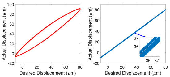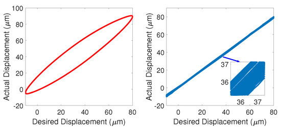The hysteresis loop compensation results of the reference sinusoid signal with , and are shown in Figure 16, Figure 17 and Figure 18. It is clear that the large hysteresis of the piezoelectric actuators in the open-loop status is effectively compensated for by the proposed strategy. Moreover, it can be seen from the figures that the linearity of the input/output with is the highest and the linearity with 50 rad/s is a bit lower compared with the two other results, which corresponds to the absolute average of the tracking errors distribution from to .