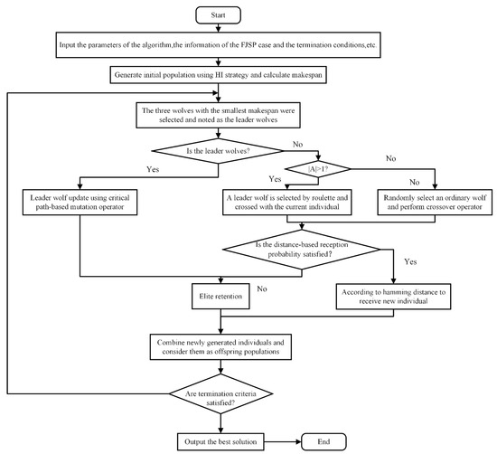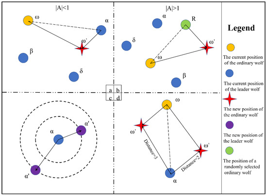 50]. Although this method discards the update formula, the idea of the algorithm is retained. Thus, it is essential to design a more reasonable discrete update operator. At present, there is already a method for the discretization of the GWO operator for solving FJSP, but the method simply retains the process of the head wolf guiding the ordinary wolf hunting in the wolf pack, and does not facilitate more excavation of GWO [