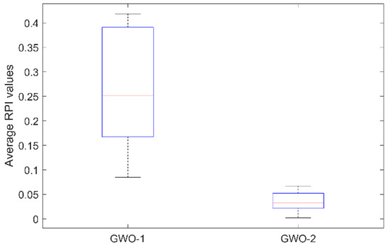 Table 11, GWO-2 always outperforms or equals GWO-1 for both makespan and critical machine load metrics. The average computation time for all instances of GWO-2 on BRdata is 14.3516. This value is smaller than the GWO-1. The resulting advantage in computation time can be attributed to the fact that the algorithm uses a transformation mechanism that requires additional computations at each generation. A comparative box plot of the average RPI values is given in