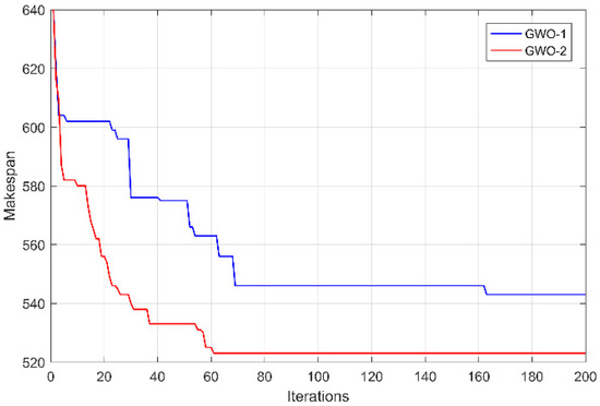 Figure 19 shows the convergence curves of the two compared algorithms on MK08. It can be found that GWO-2 converges to the optimal makespan in 61 generations, and GWO-1 converges in 163 generations. Therefore, the improved discrete update mechanism can enhance the convergence speed of the algorithm.