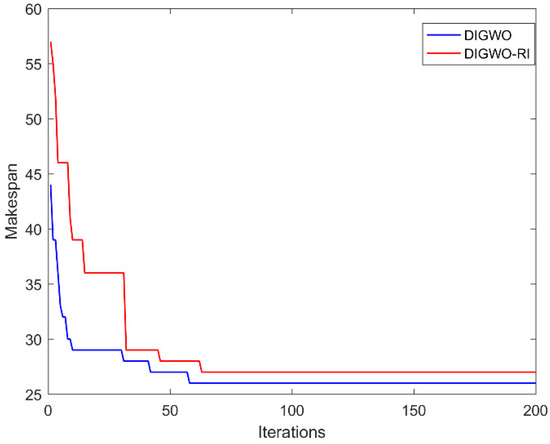 Figure 21. It is observed that DIGWO converges to the optimal makespan in 58 iterations, while DIGWO-RI converges in 63 generations. Additionally, it should be noted that DIGWO is much better than the comparison algorithm in the results of the first iteration. Consequently, the improved initialization strategy proposed in this paper can generate high-quality initial solutions and enable the algorithm to converge to the optimal solution earlier.