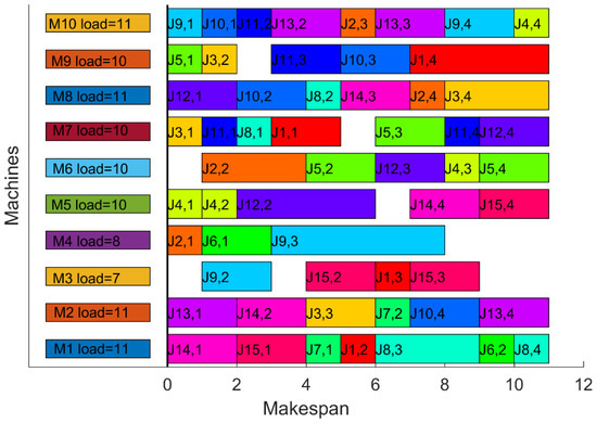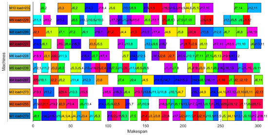 70]. The first four algorithms are metaheuristics proposed in recent years, and the rest of the algorithms are studies about FJSP. In order to ensure that the experimental environment does not have special features, the algorithms listed above are run on the same device. The maximum number of iterations is set to 200. Each algorithm was repeatedly executed 10 times during the experiment, and makespan and critical machine load among them were recorded as evaluation criteria. The results obtained from the experiments are shown in