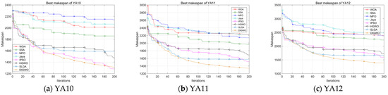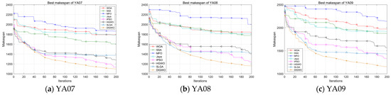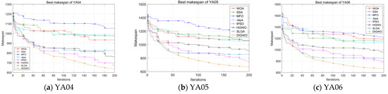 Table 17 are shown in bold font. From these data, it is evident that the proposed DIGWO obtains 11 optimal makespans out of 12 LSFJSP instances as well as the minimum critical machine load. Comparing the convergence curves of the algorithm, in most cases, DIGWO converges faster than other algorithms. Obviously, DIGWO is comparable to the makespan obtained by the metaheuristic algorithms involved in the comparison at 200 generations after updating to about 20 generations. The Friedman ranking of the compared algorithms on all problems is given in