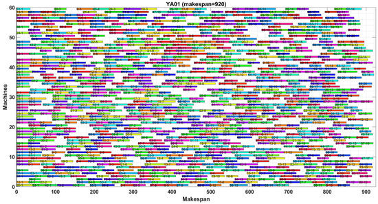 Figure 28 shows the optimal makespan Gantt chart obtained by the proposed DIGWO in YA01. The operations are denoted by “Job-operation”, and because of the large number of machines, the vertical coordinates are not annotated machine sequentially, and the horizontal coordinates in the figure indicate the processing time period of the operation. From the graph, it can be observed that the majority of machines were started for processing at the moment 0. In addition, no machine is found to be idle for a long time or overused, which is in line with the concept of smart manufacturing and effectively saving process time costs.