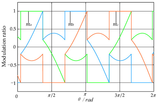 Under different θ, the modulation function of DPWM2 is shown in Table 1, where ma, mb, and mc are the modulation ratio functions for phases a, b, and c, and M is defined as U/udc. The waveforms of ma, mb, and mc in one carrier period are presented in Figure 3. It can be seen that ma, mb, and mc reach 1 or −1 alternately, and the switching devices of each phase bridge arm do not act for two 1/6 cycles.