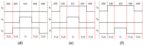 The switching sequences of DPWM2 in one carrier period under different sectors are depicted in Figure 4, which contains five segments. In Sectors I, III, and IV, 111 is utilized as the zero vector, which is located in the middle of the whole sequences. In Sectors II, IV, and VI, 000 is utilized as the zero vector, which is located in the front and end of the whole sequences. In Figure 4, T0, T1, and T2 represent the dwell time of the zero vector, the first active vector, and the second active vector, respectively. Additionally, Sa, Sb, and Sc represent the switching state of the three-phase bridges.