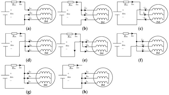 Figure 5 shows the equivalent circuits of IM fed by VSI under different switching states. In the switching state of the active vector, one phase current can be obtained from idc. In the switching state of the zero vector, idc is equal to zero, so the DC-link current cannot be detected during the switching state of the zero vector. According to Figure 5, the relationship between idc and the three-phase currents is summarized in Table 2.