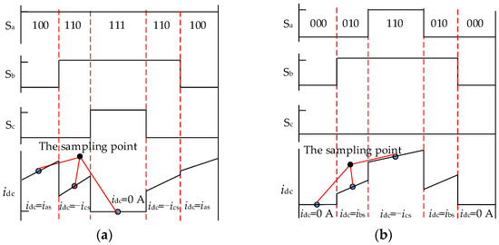 Firstly, to demonstrate the method for the three-phase current reconstruction of DPWM2 based on the DC-link current sampling, Sector I is taken as an example. The diagram is shown in Figure 6a. In the first half of the carrier period, three times of sampling are carried out in the switching states of 100, 110, and 111, respectively. Since the DC-link current is constantly changing during the active vector time, aiming to obtain the average current in each sequence, sampling is carried out at the middle time of each active vector, and the sampling current in the stage of zero vector is used to obtain the offset. Since the sum of the three-phase currents is equal to zero, the relationship between the three-phase currents and three-time sampling current (idc(k + 1), idc(k + 2), idc(k + 3)) can be described as