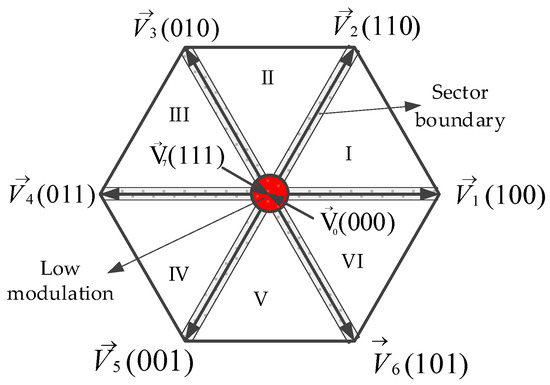It can be seen from Section 4 that the vector order of odd sectors is different from that of even sectors. Meanwhile, different sector boundaries have different active vectors whose duration time is less than Tmin, and therefore, a variety of situations need to be discussed. If the target voltage vector is located in the areas of the sector boundary, the duration of an active vector will be less than Tmin. If the target voltage vector is located in the low modulation, the duration of both active vectors is less than Tmin, and phase current reconstruction cannot be completed under the above two conditions. The areas of the sector boundary and low modulation is shown in Figure 7.