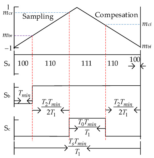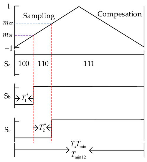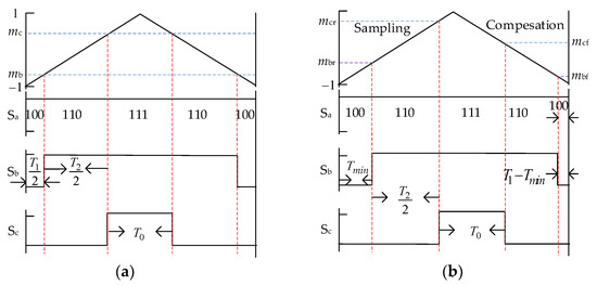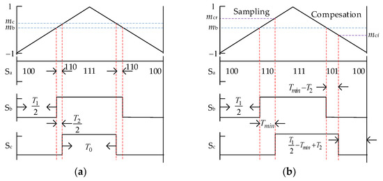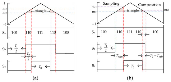 The rising stage of the carrier is noted as the sampling period, and the falling stage is noted as the compensation period. When the target vector is located in Region 1, T2, the duration of is less than Tmin. If T2 (Tmin, 2Tmin), a simple phase-shifting method can be adopted to guarantee the duration of in the sampling period is equal to Tmin, and the duration of in the compensation period is equal to (T2Tmin); the switching state in a carrier period is shown in Figure 9. It can be seen that there is no change in the duration of any vector. It is worth noting that the comparison value of phase-c in the rising stage of carrier is not the same as that in the falling stage. The triangle in Figure 9a is similar to that in Figure 9b, so the comparison value in the rising stage mcr and in the falling stage mcf should be satisfied as