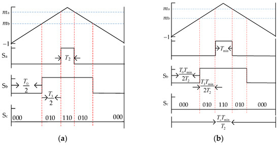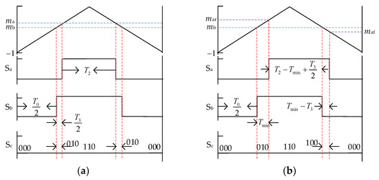 When T2 is less than Tmin, the diagram of phase shifting is shown in Figure 10. The duration of in one sampling period is set to Tmin, and the falling edge of Sc is later than Sb, so a new active vector appears, and the duration of is Tmin T2. According to Figure 10b, the synthetic voltage vector one sampling period can be expressed as