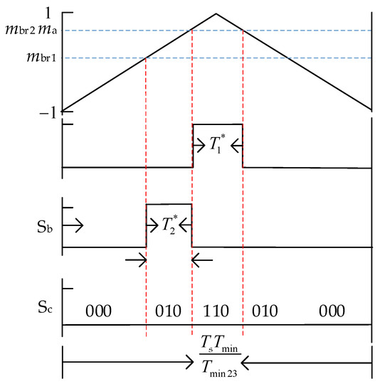 When the target vector is located in Region 2, T1, the duration of is less than Tmin. If T1 belongs to the range (Tmin, 2Tmin), the duration of in one sampling period will be adjusted to Tmin, and the duration of in the sampling period will be equal to T1 Tmin; the switching state in a carrier period is shown in Figure 11. At this time, the switching state waveforms of phase-b and phase-c are no longer symmetrical in a carrier period. The expressions of the phase-b comparison value in the rising stage mbr and the comparison value in the falling stage mbf are expressed as