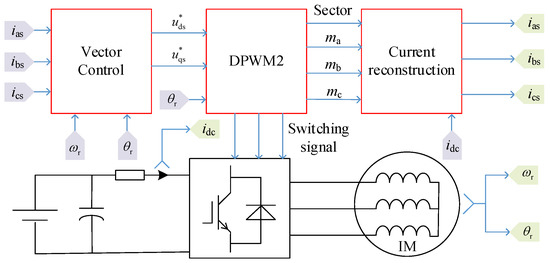 In the synchronous rotating frame (d–q axis) based on rotor flux orientation, the block diagram of the vector control scheme for the IM fed by VSI is shown in Figure 2. After executing the speed, the current inner loop, and the flux outer loop controllers, respectively, the command values of the stator voltages in the d–q axis and are obtained. In order to reduce the switching losses, DPWM2 is employed to generate the switching signals of S1–S6.
