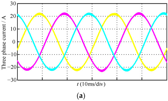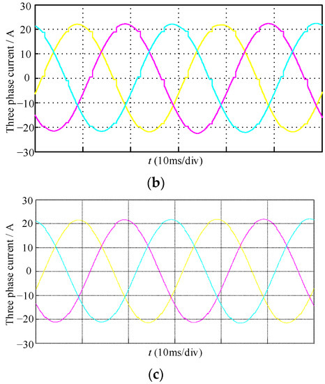 Firstly, the results of three-phase current reconstruction were compared; under the open loop control, the simulation waveforms of three-phase currents are shown in Figure 18. Without time compensation, significant fluctuations occurred in the reconstructed three-phase currents, which appeared in the transition of the sector. After time compensation, those fluctuations were obviously attenuated, and the reconstructed currents were basically consistent with the fundamental components of the real three-phase currents.