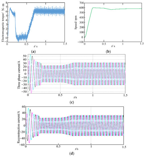 Finally, the closed-loop vector control performances based on DPWM2 were verified, and instead of current detection, the phase current reconstruction method based on the DC-link current sampling method proposed in this paper was used to obtain the stator current. The command value of the speed was set as 600 rpm, and the torque load was set to 6 N·m. The simulation waveforms of the torque, the speed, and the three-phase stator currents are shown in Figure 19. After 0.2 s, the speed reached 600 rpm without steady error. According to Figure 19c,d, the amplitude and the phase of the reconstruction of the three-phase currents are the same as the measured current.