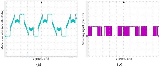 The experimental waveforms of DPWM2: (a) modulation ratio; (b) switching signal.