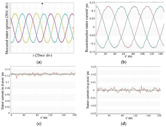 In order to verify the control performance of low modulation area, IM operates without load. The measured stator current is shown in Figure 23a. The current waveform is very smooth without obvious distortion and burrs. The reconstruction stator current is shown in Figure 23b, which indicates that a good reconstruction effect can be obtained. Figure 23c,d show the waveforms of the stator current in the d–q axis, indicating that both ids and iqs can track the command value without a large ripple. The experimental results show the feasibility and correctness of the three-phase current reconstruction method with sampling time compensation for DPWM2.