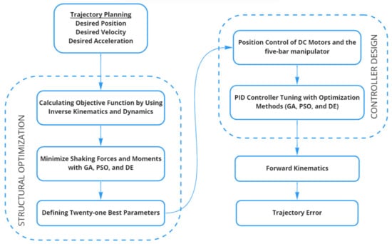 In practice, the control of a manipulator is also an important issue. Among the numerous works in this field, some important ones related to the present work will be mentioned here. In [36], the prototype of a planar parallel manipulator with five-bars was created by a multi-disciplinary study, and the simulation results were compared with the measurement results by performing the PI control. Tao and Sadler [37] developed the constant speed control of a four-bar mechanism driven by a motor using a state-space representation, and several modified PID-type rules were implemented. In recent years, various control algorithms seem to work together or nested. [38,39,40]. In [40], the extreme learning machine-PID controller has shown that it outperforms the pure P and PID controllers with the adaptive tuning of the control parameters. Optimization methods such as GA [38] and PSO [39] are used, especially to select the coefficients of the widely used PID controller. In this study, the gains of the PID controllers are determined using an optimization technique after solving the problem of balancing the shaking forces and moments.