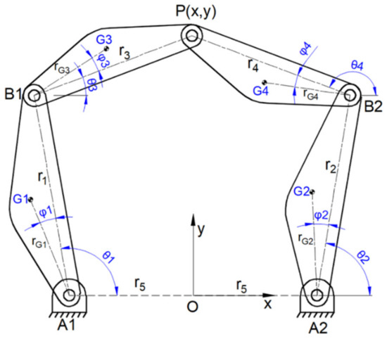 The general view of the five-bar manipulator used in this paper is illustrated in Figure 2. Provided that the physical features and positions of the links and the desired motion profile of point P are known, the angular position, velocity, and acceleration values are determined from inverse kinematic analysis.
