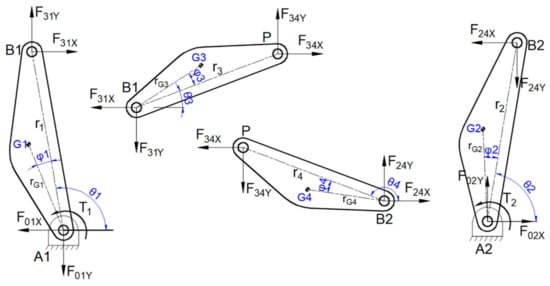 In this part, to determine the shaking forces and moments transmitted to the machine foundation, the dynamic analysis of the mechanism is carried out by using the well-known Newton–Euler principle. The free-body diagrams are given in Figure 3.