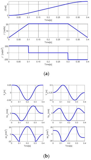 The trajectory is comprised of three main parts, as shown in Figure 5a. These plots represent the angular position, angular velocity, and angular acceleration of the endpoint P. For a circular trajectory, the endpoint P position, velocity, and acceleration according to the motion as defined in Figure 5a are given in Figure 5b.