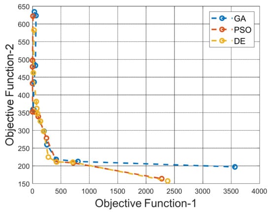 When the multi-objective function is used singularly, the best result is determined in two ways. First, by displaying the objective function one versus function two on a graph, the closest value to the origin can be chosen. Secondly, the minimum value can be found by taking the square root of the sum of the squares of the objective functions. The graphical representation of the obtained objective function one and objective function two values are given in Figure 6.