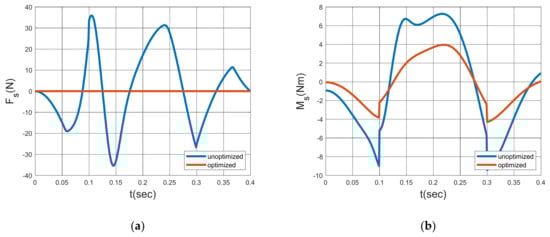 While following the circular trajectory, the shaking force, shaking moment, and driving torques in the initial state, and after optimization are shown in Figure 7.