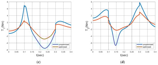 Results of optimization: shaking force (a), shaking moment (b), driving torque 1 (c), and driving torque 2 (d).
