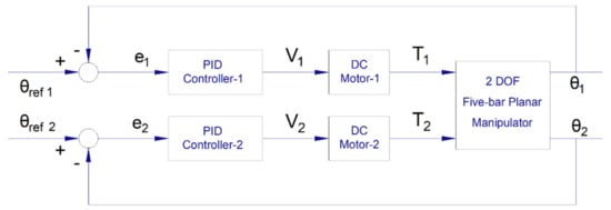 As mentioned above, the control of a manipulator is essential to practical applications. Therefore, this section is devoted to the design of the controller based on the PID algorithm. The block diagram of this system is presented in Figure 8.