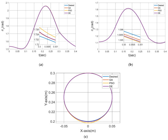 Control results, first motor angle (a) and second motor angle (b), applied trajectory (c).