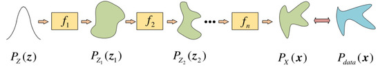 Specifically, the flow model assumes that the original data distribution is , the prior hidden variable distribution is (usually a standard Gaussian distribution), the reversible transformation function is (), and the generating transformation function is (). The variable substitution method based on the probability distribution density function can be obtained as: