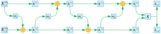 Specifically, the structure of the NICE model is shown in Figure 2. First, input is randomly divided into two parts ( and ) according to the dimension, and enters the first additive coupling layer, where directly obtains , . After the coupling of , add it to to obtain ; that is, the additive coupling layer does not perform the coupling operation on the first part. Then, swap and , and then enter the next additive coupling layer, where directly obtains , and is coupled with and then added with to obtain , and so on, with four additive coupling layers. Take the coupling layer structure as an example. Finally, and are jointly inputted into the scale compression layer (S) and and are output and concatenated into zi.