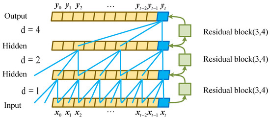 The TCN network proposed by Bai et al. [47] is a CNN model with a special structure. It is based on the traditional one-dimensional CNN called 1-D FCN, combined with causal convolutions and dilated causal convolutions. A new network model is obtained by combining dilated causal convolutions and residual blocks in the TCN architecture. In order to input the time step as in RNN, the output time step is also the same length; that is, the input of each time has a corresponding output, which uses the structure of 1-D FCN in each hidden layer. The time length of the input and output are the same, and the same time step is maintained; in order to ensure no leakage of historical data, we do not use a traditional convolution but a causal convolution is selected. The data output at time is only related to the data at time and before time , that is . In order to effectively deal with the problem of long historical information, dilation causal convolution is introduced, which still has causality, and the dilation factor is introduced, which is generally dilated. The coefficient is an exponential power of 2. In order to solve the problem of gradient disappearance that may be caused by a deeper network structure, a residual block is introduced to improve the generalization ability of the TCN structure. As shown in Figure 3, a TCN structure with a convolution kernel size and a maximum expansion factor of three and four is simulated.